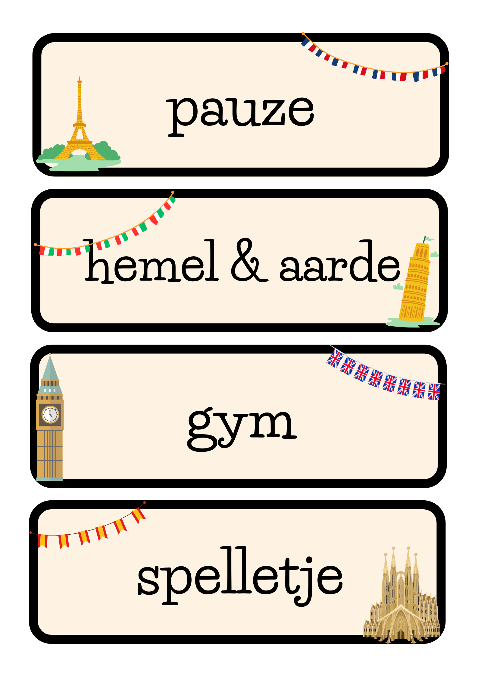Bij het document zitten 92 dagritmekaarten, een aantal opties voor een klassenversiering, alle dagen van de week, maanden van het jaar en tijdkaarten vanaf 8:30 uur tot 15:00.