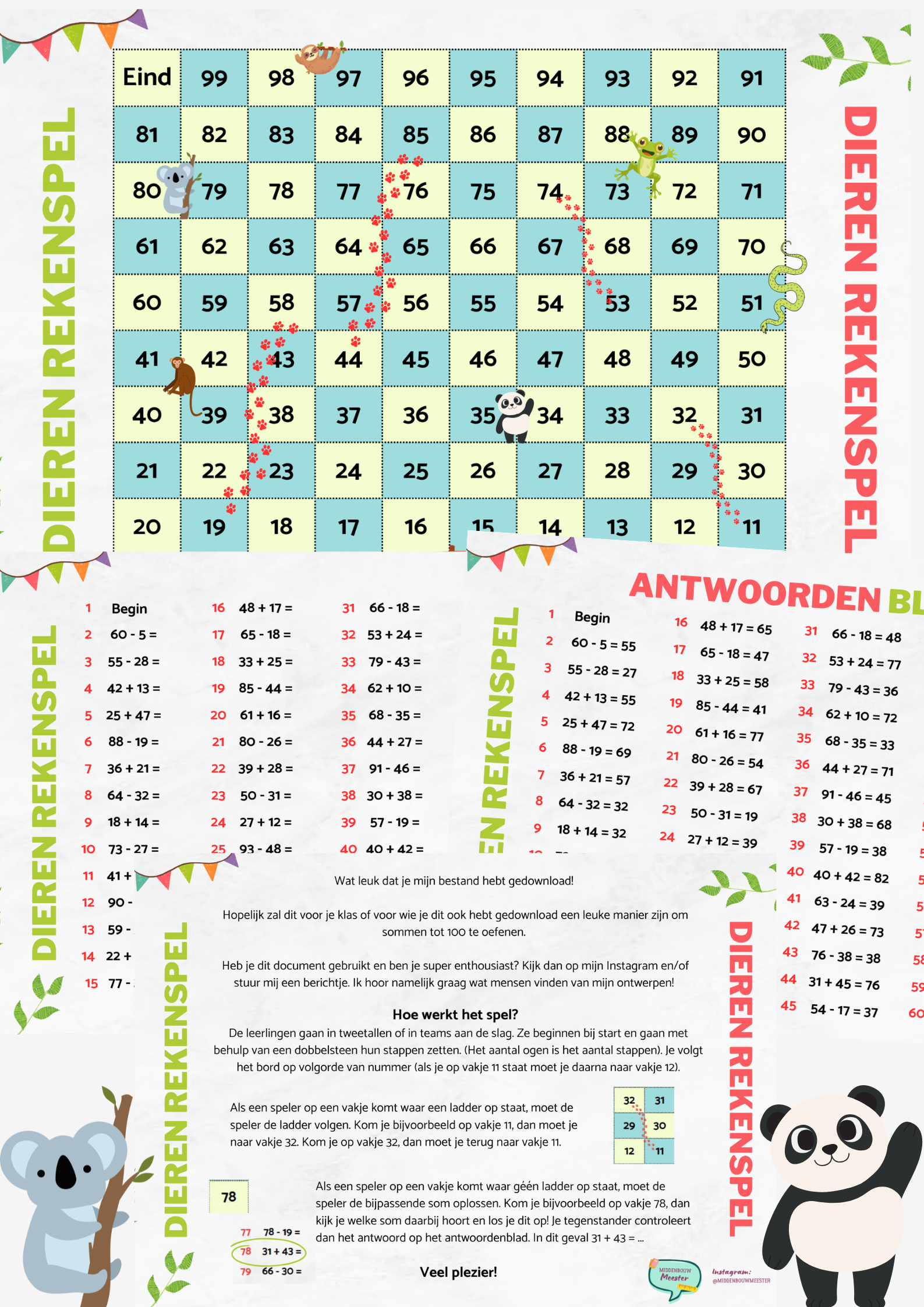 Met het Dieren Rekenspel wordt rekenen een vrolijke, zelfstandige activiteit! Leerlingen dobbelen over een kleurrijk spelbord vol schattige dieren, en lossen onderweg sommen op tot en met 100. Dankzij het bijgevoegde antwoordenblad kunnen ze elkaar controleren – perfect voor duo’s of kleine groepjes.