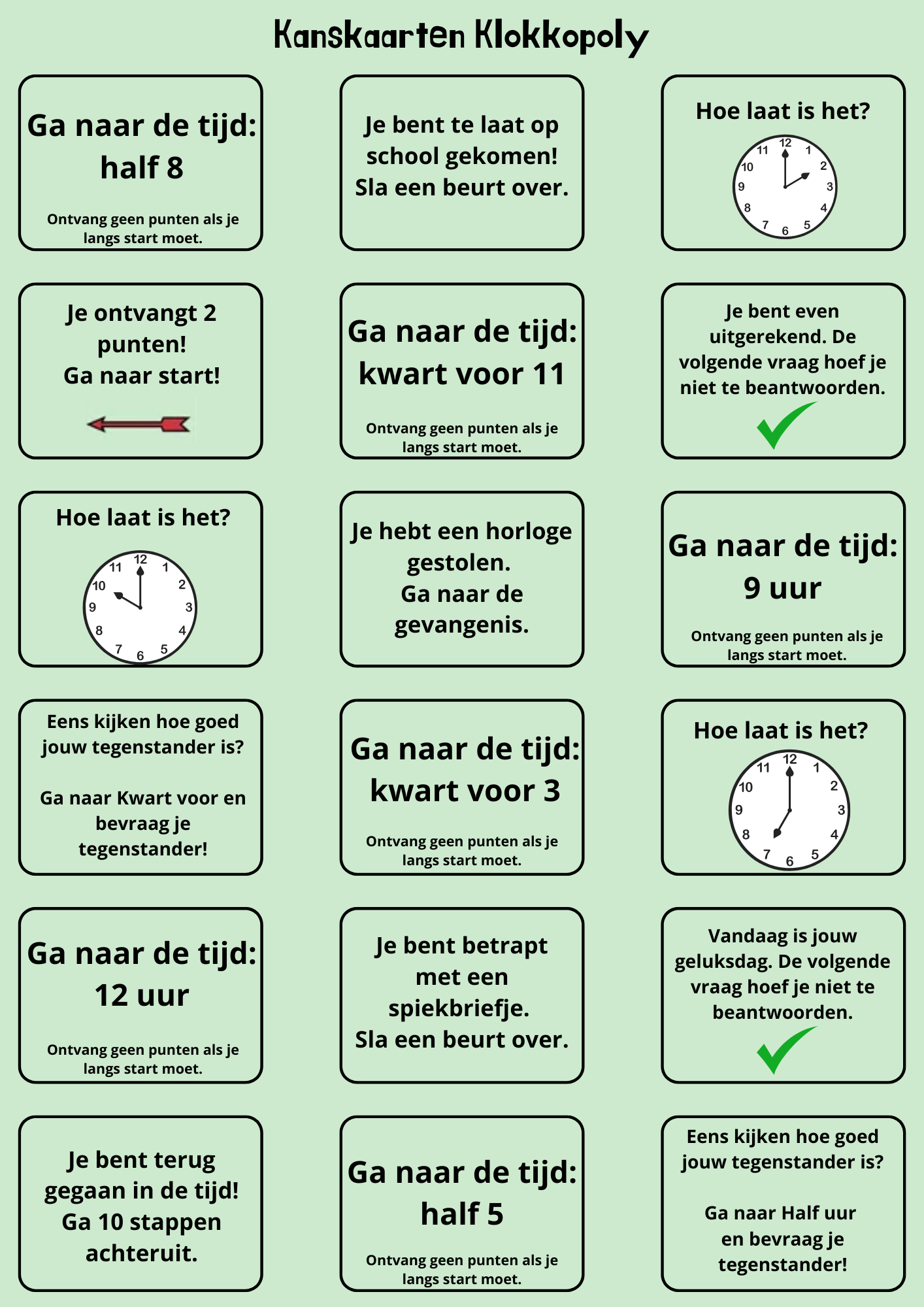 Met deze Klokkopoly kunnen leerlingen door spelend leren het klokkijken oefenen! Deze versie heeft een variatie van hele uren, halve uren en kwartieren.