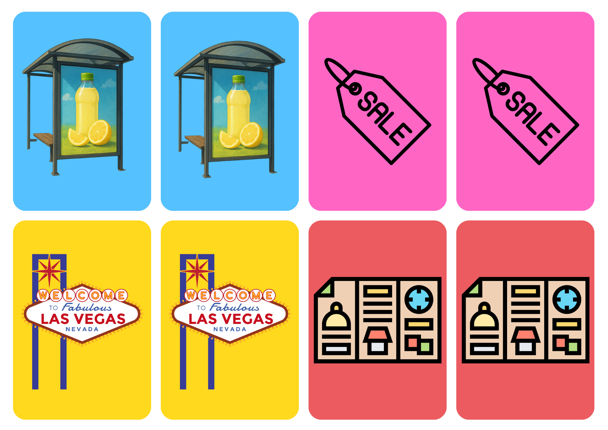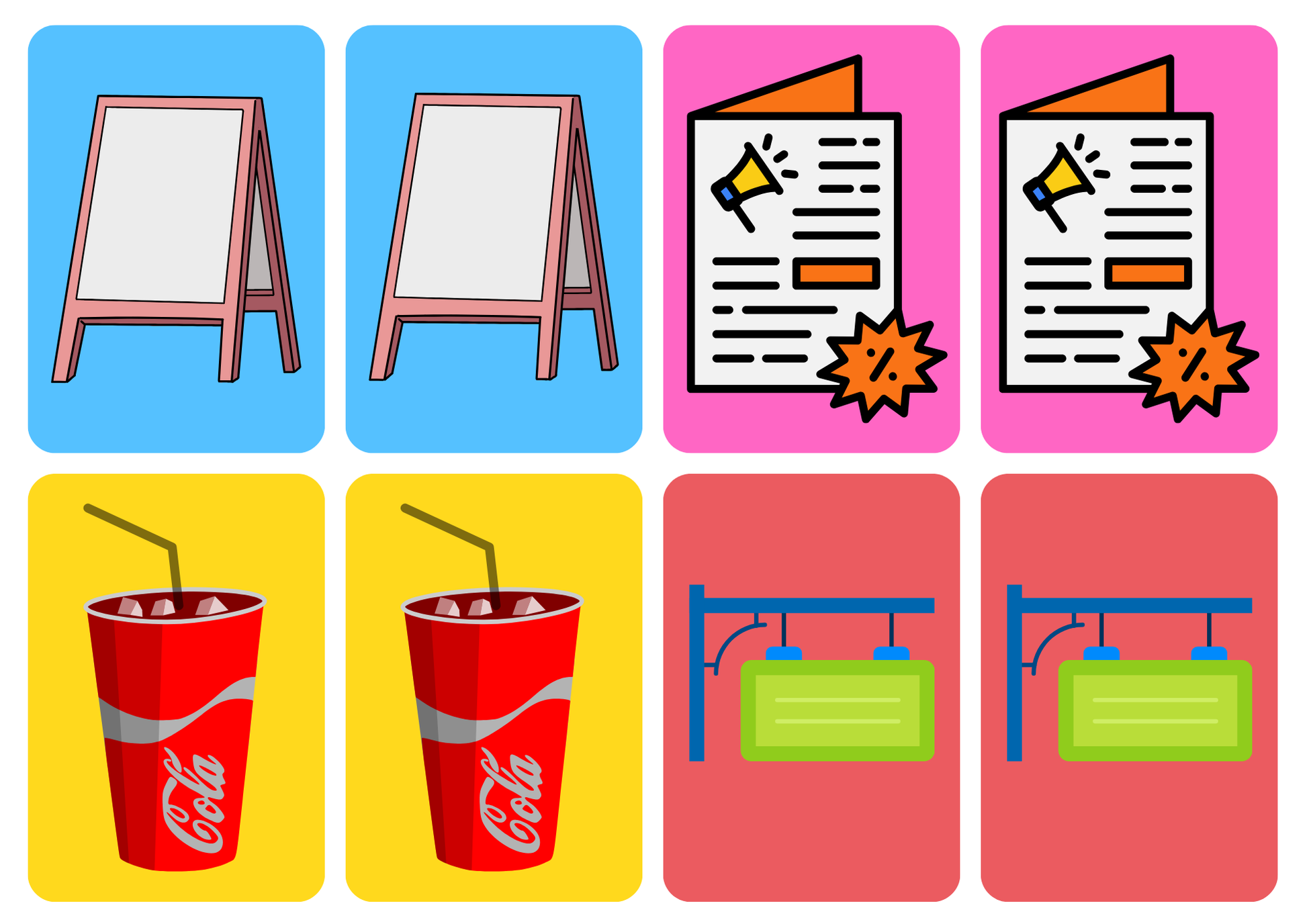 Breng de reclames tot leven in de klas met de Matching Cards – Thema Reclame! Deze set kaartjes staat vol herkenbare aanbiedingen en posters, perfect om te gebruiken als memoryspel of om tweetallen te vormen.