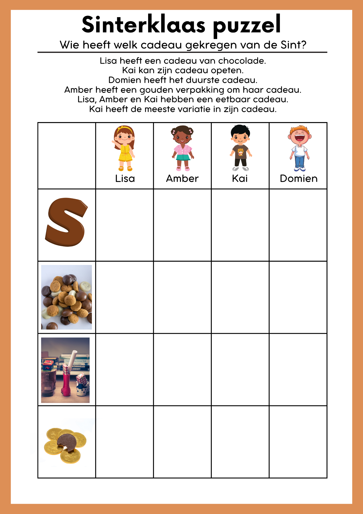 Logisch redeneren puzzel – een uitdagend Welk pakketje hoort bij wie?-raadsel, ideaal voor denklessen.
