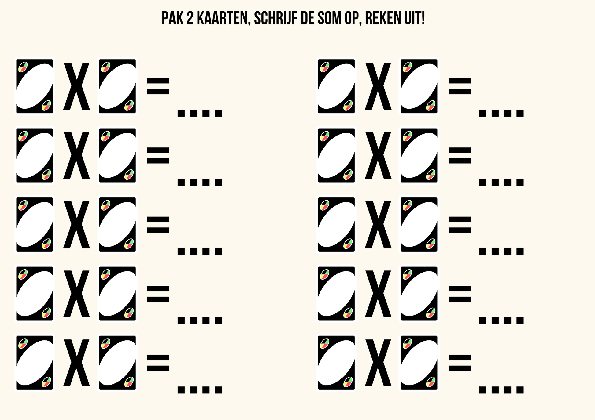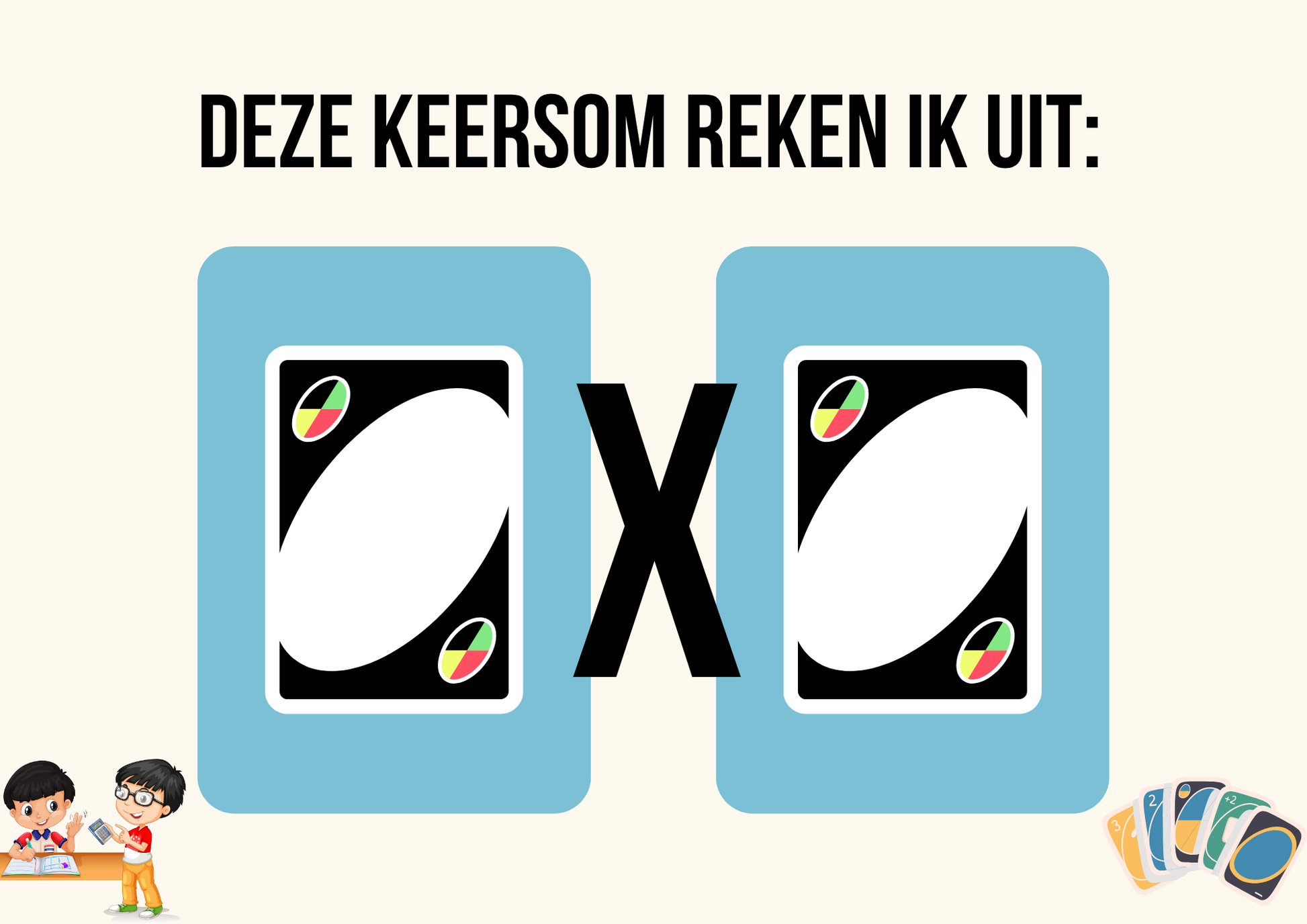 Maak van keersommen oefenen een feestje met UNO Keersommen! In dit dynamische spel leggen leerlingen UNO-kaarten willekeurig op de aangegeven plekken, waardoor er steeds nieuwe keersommen ontstaan. Ze lossen de sommen op, wisselen de kaarten en starten direct een nieuwe ronde – eindeloos speelplezier én veel rekenoefening in één.